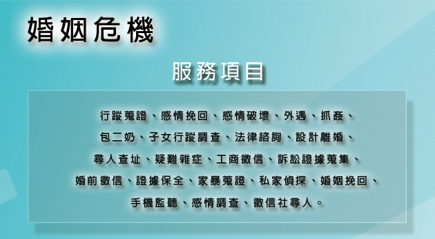 服務項目包含了:婚姻危機、感情挽回、感情破壞、外遇、抓姦、包二奶、婚姻危機調查、法律諮詢、設計離婚、尋人查址、疑難雜症、工商徵信、訴訟證據蒐集、婚前徵信、證據保全、家暴蒐證、私家偵探、婚姻挽回、手機監聽、感情調查、徵信社尋人。